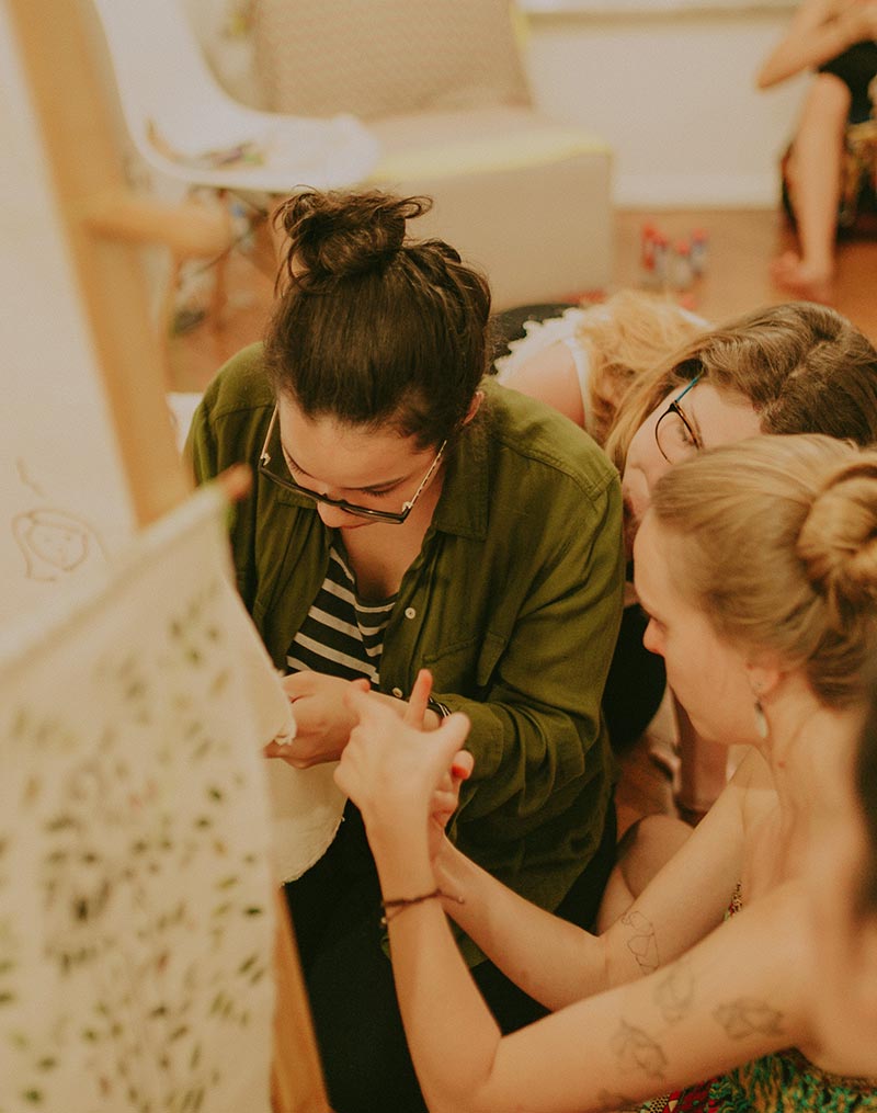 Os encontros são conduzidos por meio de propostas disparadoras – como imagens, obras de arte, músicas, palavras, textos ou temas – que convidam à criação plástica e simbólica.
